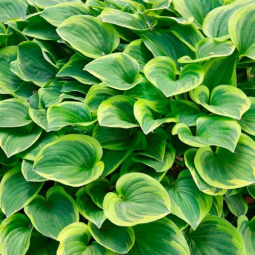 Kicsi, széles szív alakú leveleit aranysárga szegély díszíti. Kifejlett magassága 30-40 cm, kiváló színes borítást adó évelő. Mutatós virágai sötét lila színűek, júliusban nyílnak, jó vágott virágok. Árnyékos helyre ültessük. Konténeres (9×9)