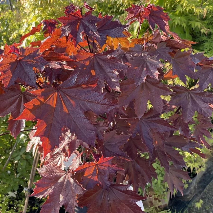 A ‘Crimson Sentry’ fajta az alapfajhoz képest fele akkorára nő (10-15 m), ágai felfelé törők, kezdetben sűrű, teljesen oszlopos növekedésű, később hosszúkás piramis alakú koronát nevel. Levelei ötkaréjúak, mélyen kihegyezettek. Kihajtáskor fényesek, világosbordóak. Nyáron bordósbarnára sötétednek, fényüket elvesztik. Ősszel vöröses-bronz színt öltenek. Virágai enyhén illatosak, aprók, sárgák, lombfakadás előtt nagy tömegben bogernyőben nyílnak. Napos, esetleg félárnyékos, helyet kedvel. Minél több árnyékot kap, lombja annál inkább visszazöldül, tehát igazán mélybordó lombot csak tűző napon nevel. Lehetőleg mészben gazdag, mélyrétegű, tápanyagdús talajt kíván. Keskeny lombja miatt kiválóan alkalmas kisebb kertekbe, vagy szűkebb utcákba sorfának. Jó a várostűrő képessége, jól viseli a forgalmas utak melletti füstgáz szennyezést.