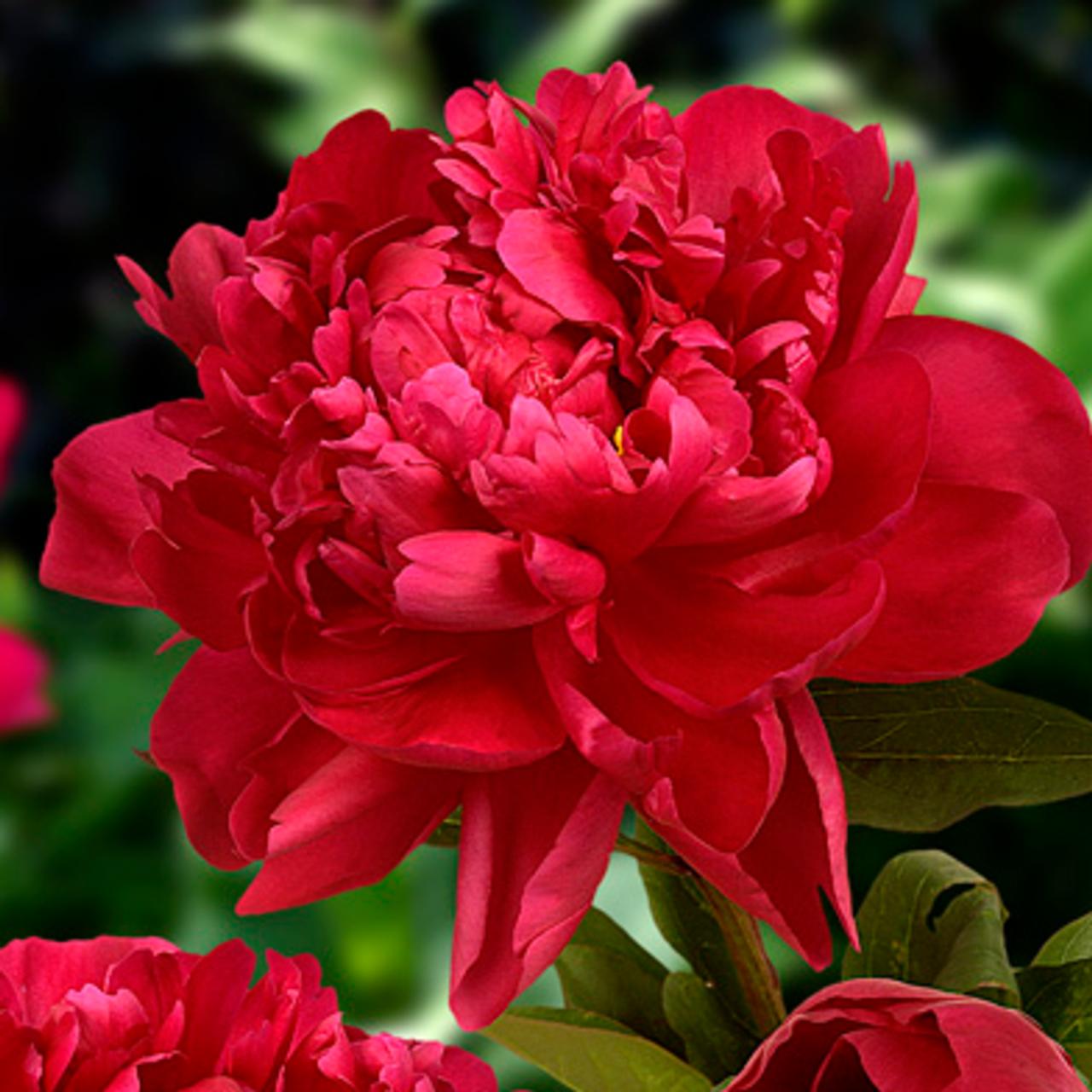 Különlegesen szép lágyszárú dísznövény. Hatalmas dupla virágú, élénk piros színű, nem halványodik. Virágzása május végén kezdődik, hosszan tart. Erőteljes szárai tavasszal hajtanak ki a talajból, és szeldelt leveleivel sűrű lombozatú, kb. 1m magas bokrot alkotnak. Alapvetően igénytelen növény, amely azonban napos fekvést és elegendő teret igényel magának. Fontos, hogy ne ültessük túl mélyre, és időről időre lássuk el bőséges komposzttal. A bazsarózsa nem szereti, ha bolygatják, akkor érzi jól magát, ha sok évig ugyanazon a helyen maradhat. Virágzás után a levelei elsárgulnak és visszahúzódnak a gyöktörzsbe.