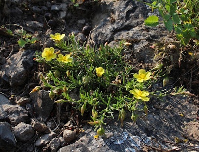 5-15 cm magas, kis termetű, törpe cserje. A fás tőböl eredő szár vékony, körben heverő, végei felemelkedők. A levél 0.5-2 cm hosszú, keskenyek, ár alakúak, részben porcos-szálkás hegyű, rányomott pelyhes-szőrös, szürkészöld. A virág magános, végálló vagy levélhónalji. A szirom sárga, 8-10 mm hosszú, visszás-tojásdad. Csészéje 3 nagy, belső- és 2 kisebb külső csészelevélkéből áll. Májustól szeptemberig virágzik. Sziklkartekbe is ideális választás.