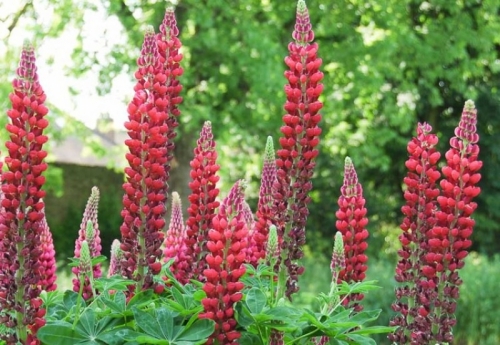 80-100 cm magas, felálló szárú, terebélyes évelő. Piros, hosszú, nagy méretű, virágfürtjeit május-június hónapban hozza. Nagy levelei, zöld, csillag alakúak, tenyeresen összetettek. Kissé savanyú, magas tápanyagtartalmú talajt, nedves, napos, félárnyékos helyet igényel.
