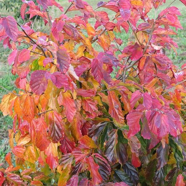 8-10 méteres magasra és kb 4-6 méter szélesre nő. Ágrendszere felfele törő. Lassú növekedésű, a végleges magasságát kb. 10 év alatt éri el. Hullámos szélű, mélyen erezett levelei kihajtáskor lilás-zöld színűek, majd idővel teljesen bezöldülnek, ősszel pedig sárga-narancs-vörös színekbe borulva pompáznak. A virágok kissé hasonlóak a varázsmogyoró virágához, pirosak, tél végén – tavasz elején nyílnak. Szürkés barnás barkáival a levélhullást követően is dekoratív marad. Napos fekvést igényel. Tápanyagban gazdag, jó vízáteresztő képességű talajt igényel. Meszes talajban is szépen fejlődik, ugyanakkor savas talajban erőteljesebb a levelek elszíneződése. Vízigénye közepes, a fiatal egyedeket rendszeresen öntözzük.