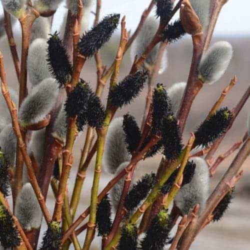 Sötétzöld levelei kihajtáskor ezüstösen hamvasak. Legfőbb ékességei a tavasszal nagy tömegben fejlődő fekete barkák, melyek a vöröses vesszőkön fakadnak, majd az elnyílás során ezüstös árnyalatot vesznek fel. Annak érdekében, hogy a növény elegendő fiatal vesszőt hozzon, melyeken a legnagyobb számban fejlődnak a mutatós barkák, 2-3 évente erőteljesen vágjuk vissza, 30-50 centivel a törzs fölött.